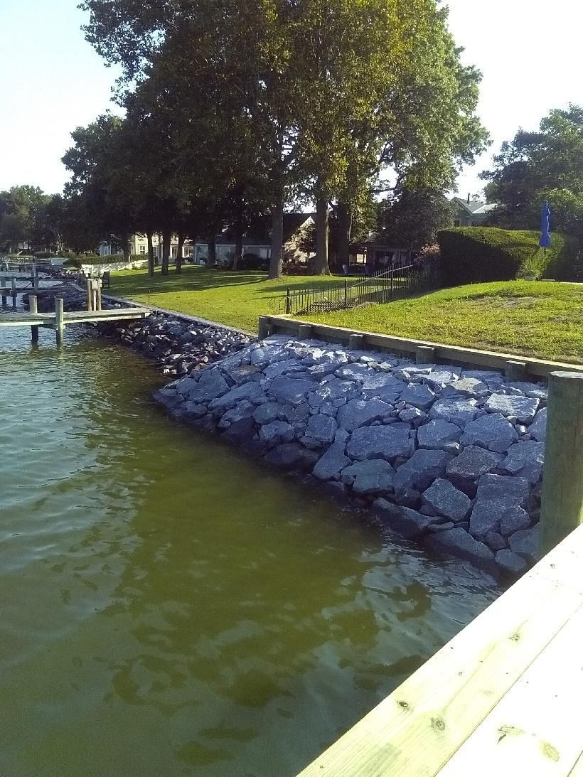 Stone revetment, commonly known as rip rap, is one of the most effective solutions for shoreline erosion control, especially in areas like the Chesapeake Bay. By strategically placing large stones along your shoreline, we can create a durable barrier that absorbs wave energy, reduces the impact of currents, and prevents soil loss. At Bailey Marine Construction, we specialize in designing and installing stone revetment systems that protect your property and enhance the beauty of your waterfront. Contact us today for an estimate!